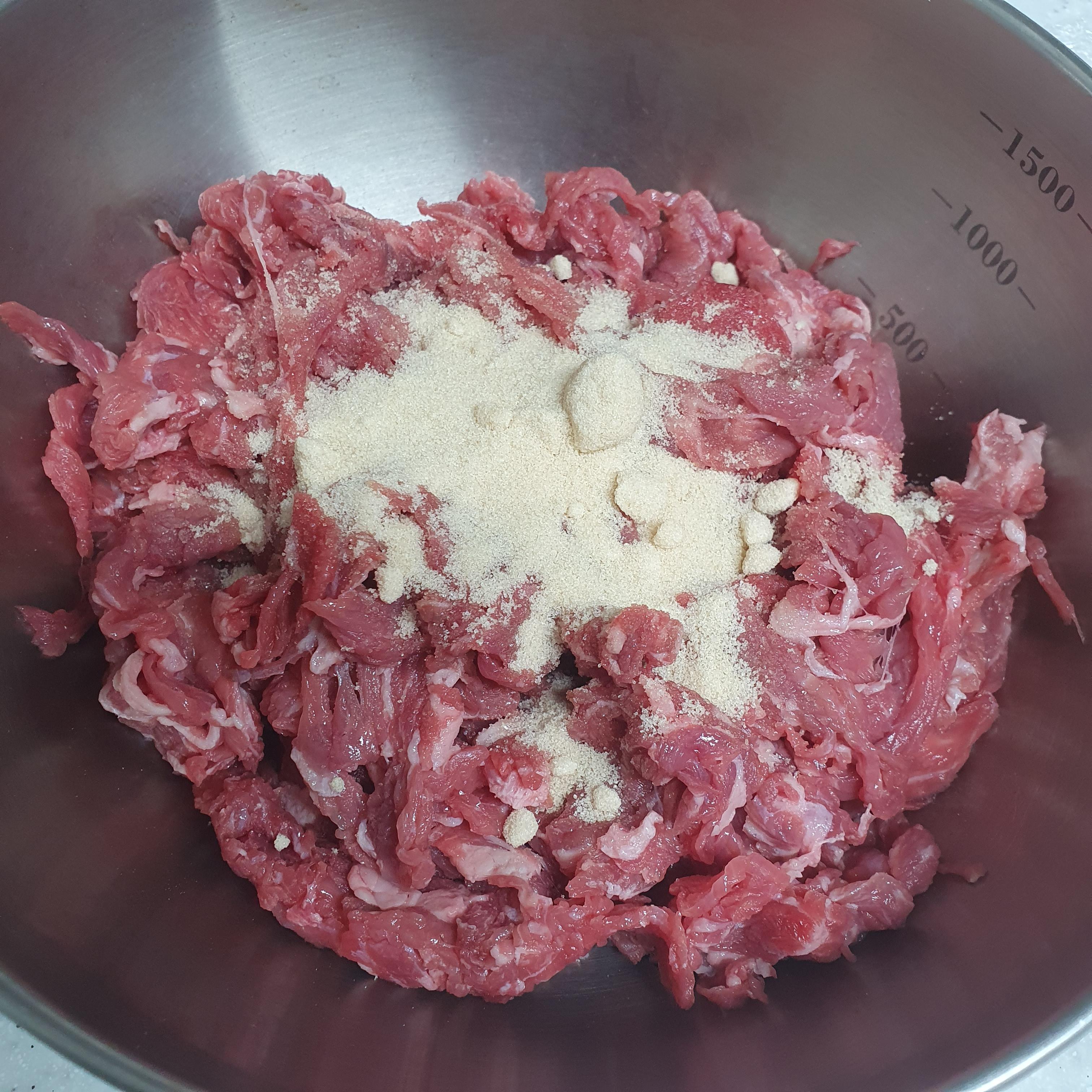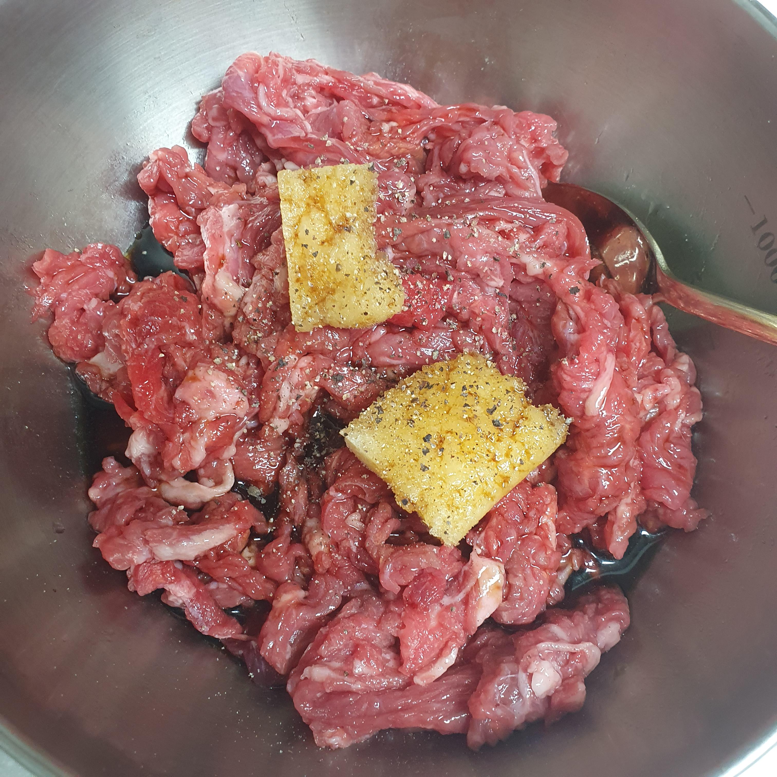 소고기에 설탕,미림,물엿을 먼저 넣고
